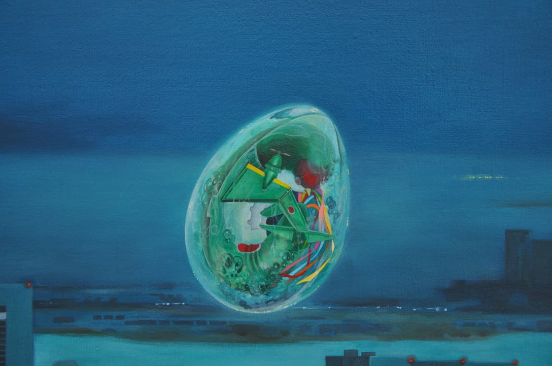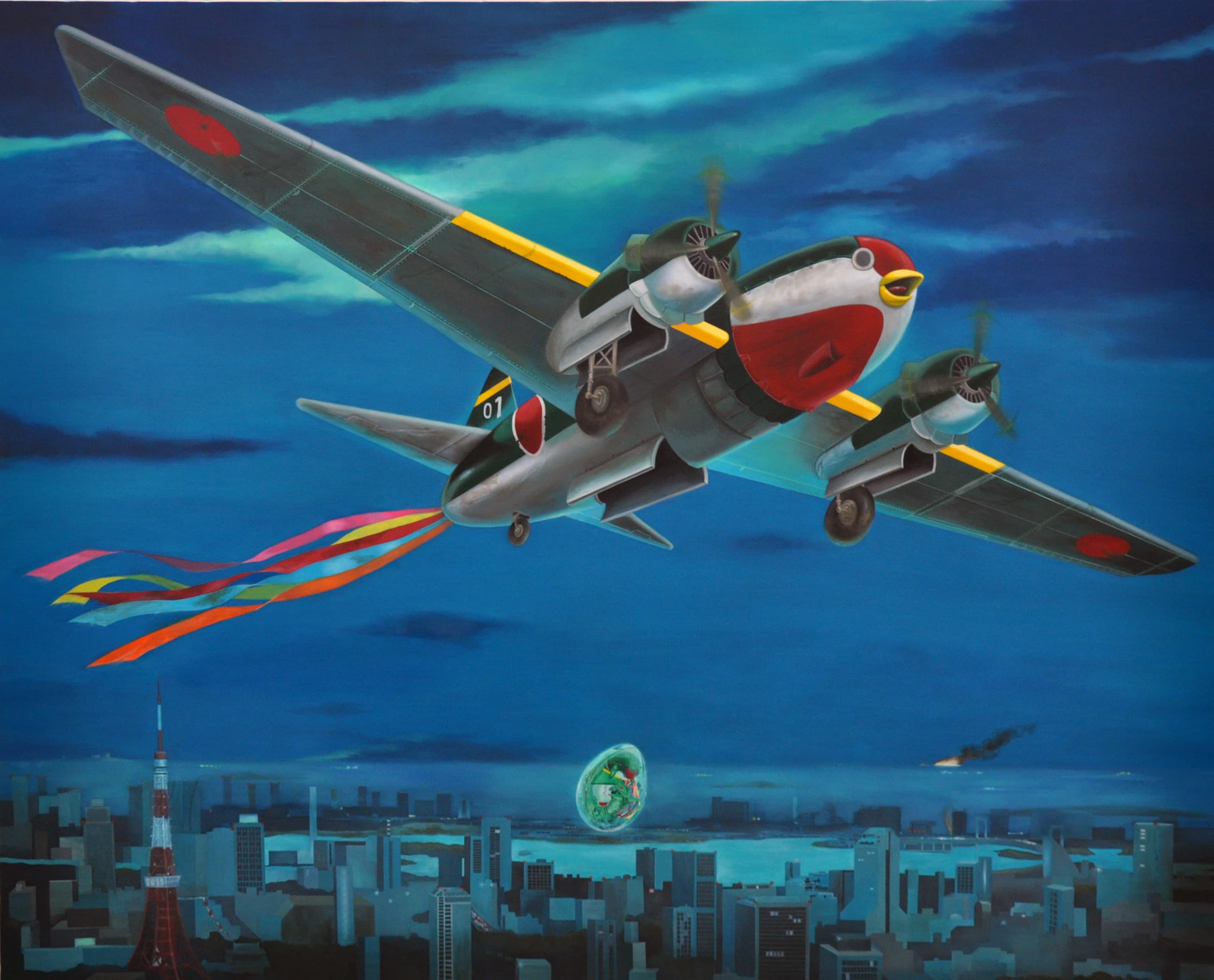 繰り返される戦いをテーマに、ツバメ型戦闘機が卵を産みながら飛行している様子を描いた。